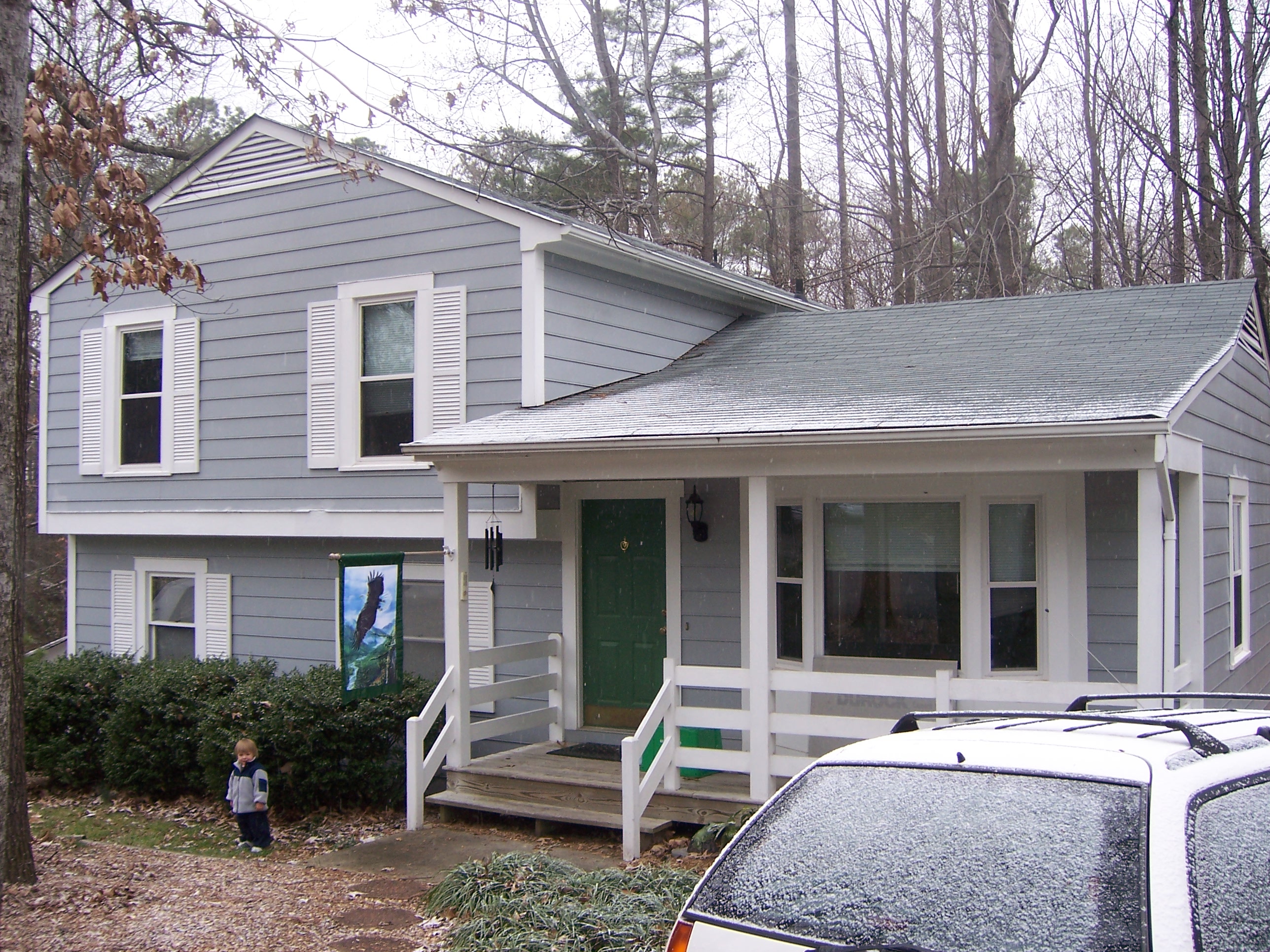 Then Amber went hog-wild in cleaning up the backyard so that we could create a play area. We rented a chainsaw, cut down a few more trees, had co-workers collect most of our large fallen trees (thanks Dave and Pat!)... Then on one (rainy) Saturday, we rented a 16' Penske truck, loaded up the rest of the trees parts (canopies, small branches) and most of the dog pen, dumped it all at the town dump, went to Toys 'R' Us, picked up a swing set, a ton of lumber, then returned home exhausted.